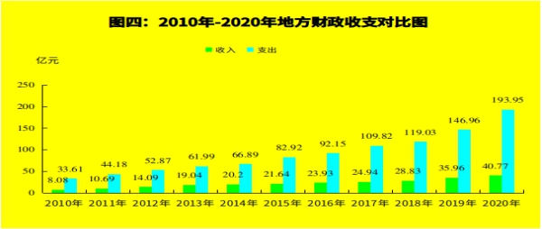 2020年地方财政支出193.95亿元,增长31.5%,一般公共预算支出128.44亿元,增长10.8%。其中,一般公共服务支出11.11亿元,增长4%;公共安全支出11.19亿元,下降5.4%;教育支出17.29亿元,增长0.6%;科学技术支出2.28亿元,增长16.9%;文化旅游体育与传媒支出2.08亿元,下降6.3%;社会保障和就业支出12.59亿元,下降19.7%;卫生健康支出9.81亿元,增长65.5%;节能环保支出6亿元,下降15.3%;城乡社区支出12.65亿元,下降5.3%;农林水支出20.26亿元,增长49%;交通运输支出9.22亿元,增长2.8倍;资源勘探信息等支出2.21亿元,增长1.8倍;住房保障支出3.73亿元,下降35.8%。政府性基金预算支出65.48亿元,增长1.1倍。