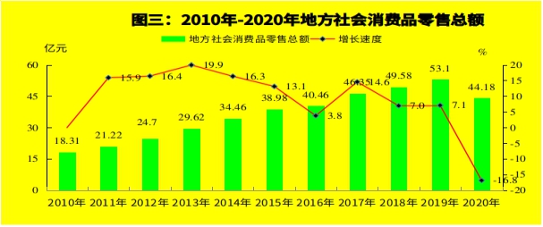 2020年地方社会消费品零售总额44.18亿元,同比下降16.8%。按城乡划分,城镇实现消费品零售额37.4亿元,同比下降14.7%;乡村实现消费品零售额6.8亿元,同比下降15.3%。按行政区域分,博乐市社会消费品零售总额31.52亿元,同比下降16.9%;阿拉山口市1.31亿元,同比增长16.8%;精河县8.17亿元,同比下降15.9%;温泉县3.18亿元,同比下降18.1%。按消费形态分,餐饮收入6.2亿元,同比下降20.6%;商品零售38亿元,同比下降16.1%。